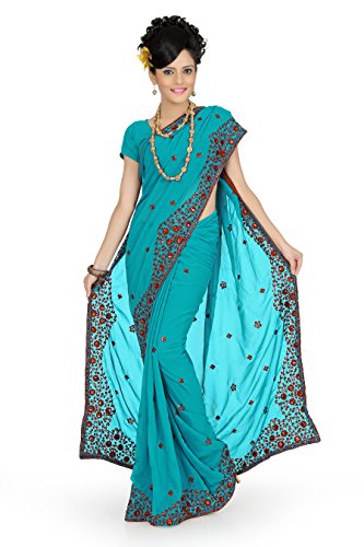 Designersareez Women"s Faux Georgette Embroidered Saree Free Size Medium Teal