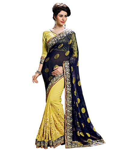 Shonaya Blue &Yellow Georgette Embroidery Saree With Unstitched Blouse Piece