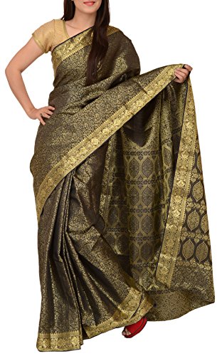 – Elegant woven artificial silk (art silk) sari. With all over golden brocade weaving work. Intricate golden weaving work on Border & Pallu. Sari has a matching unstitched blouse piece.